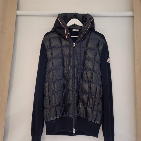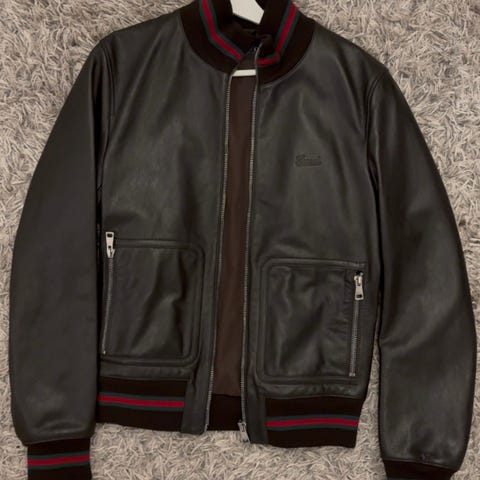 Gucci jacka för herr i storlek 52. Jackan är blå och tillverkad i ull, m fl med ribbade muddar i klassika Guccifärger vid ärmslut och nederkant. Tillverkad i Italien.