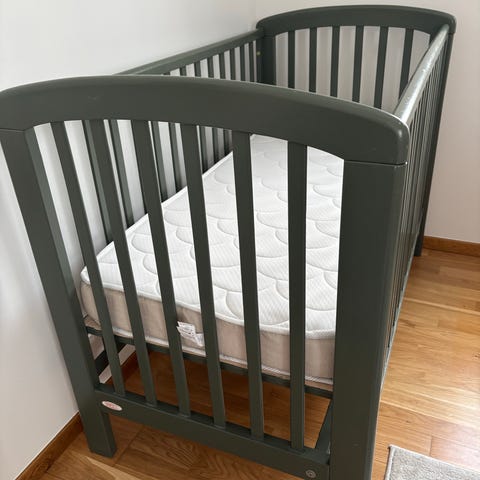 Babysäng målad i en fin dov grön färg. Ena sidan är borttagbar och möjlig att montera i olika höjdlägen för att passa bredvid en vuxensäng. Madrass ingår men har några missfärgningar, se bild.