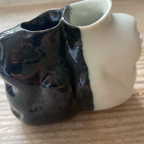 Okänd vas i keramik med vertikala ränder i vitt och brunt. Vasen har en organisk, något ojämn form med en liten utbuktning på sidan. Passar för snittblommor eller som dekorativ inredningsdetalj. Placeras exempelvis i fönster, på hylla eller bord.