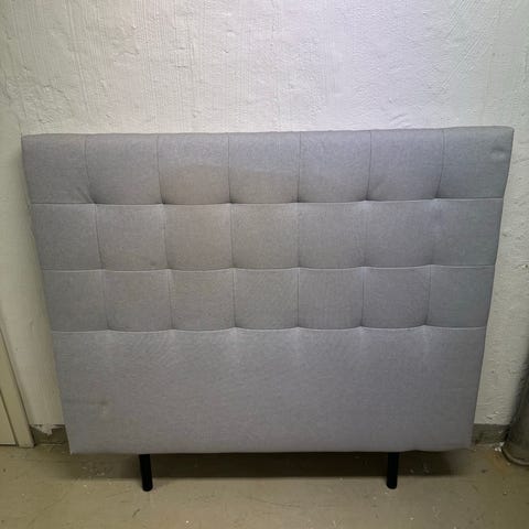 IKEA sänggavel för säng 140 cm. Klädd i mörkgrå textil med rutmönstrad, vadderad framsida. Ger stöd för rygg när man sitter upp i sängen och skyddar väggen bakom. Mått enligt bild: bredd ca 140 cm, höjd ca 125 cm. Passar standardram för 140 cm-säng.