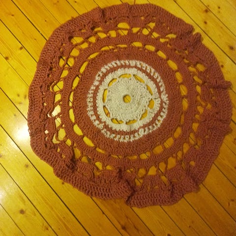 2 st nya runda mattor i bomull, tryckt mönster och kantband i vinrött.