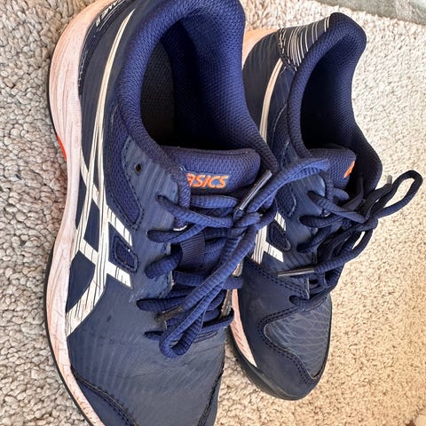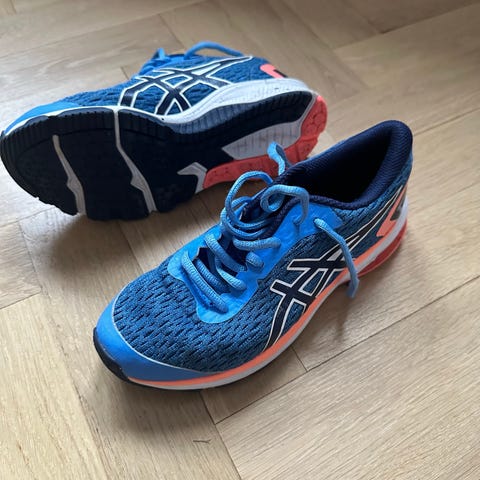 Asics träningsskor i storlek 38. Skorna har ovandel i blått meshmaterial med svarta detaljer och snörning. Yttersulan är i gummi med mönstrad undersida för grepp. Passar för träning och annan vardagsanvändning där lätta och ventilerande skor önskas.