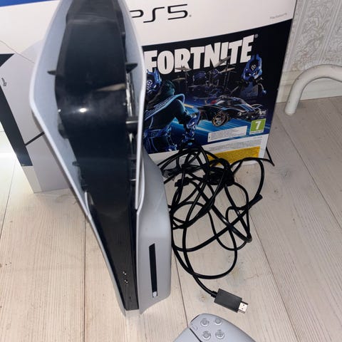 Sony PlayStation 5 spelkonsol med tillhörande blå handkontroll. Konsolen är vit med svart detalj och är avsedd för spel, film och streaming. Handkontrollen är en trådlös modell anpassad för PlayStation 5-systemet. Man kan även trade en pc mot mina grejer om ni trader en pc får ni en skärm i köpet passa på