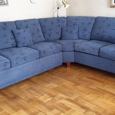 IKEA bäddsoffa i hörnsoffmodell i blått tyg. Soffan har schäslong på ena sidan och kan fällas ut till en säng med utdragsdel och madrass. Passar som kombinerad sitt- och sovplats i vardagsrum, gästrum eller mindre bostäder där extra sovplats behövs.