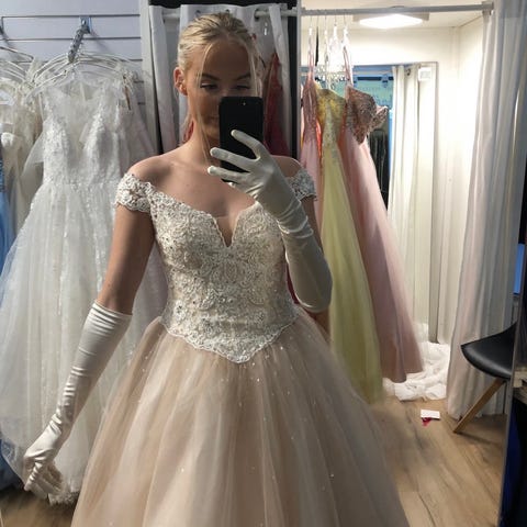 Säljer nu min rosa balklänning som jag dansade bal med 2025 🩷. Den är från början köpt från Bröllopshuset och har dansats med på två baler. Klänningen är ljusrosa med vit spets och glitter. Den är i storlek 36 och jag är 172cm för referens. Baktill stängs den med en dragkedja.