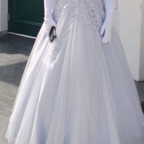 Till balklänningen ingår en underkjol med två ringar, handskar, skor i storlek 39 och en väska. Även ett klänningsfodral ingår.