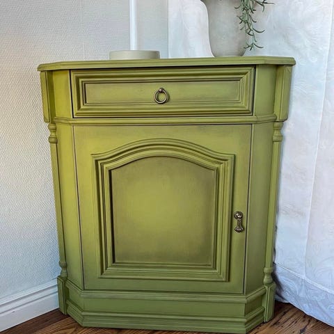 Hörnskåp i vitt trä med två dörrar, en övre och en nedre. Skåpet har profilerade dörrfronter och beslag i metall. Passar för förvaring i hörn av rum, exempelvis i kök, vardagsrum eller hall. Fristående möbel som placeras direkt mot vägg i hörn.