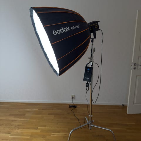 En stor softbox från Godox. Den är i perfekt skick då den har i princip stått monterat på en ljusstativ.