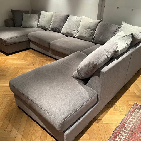 Grå soffa med divan från R.O.O.M. modell: Manhattan. Avtagbart tyg. Inga synliga fläckar.