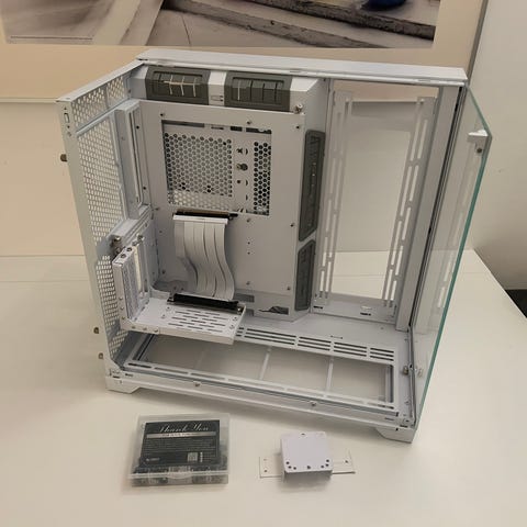 Datorchassi i svart med glaspanel på sidan. Ovansidan har ventilerad metallpanel för luftflöde. Chassit är tomt och avsett för montering av egna komponenter som moderkort, nätaggregat, lagring och kylning. Passar som grund för stationär dator eller uppgradering av befintligt system.