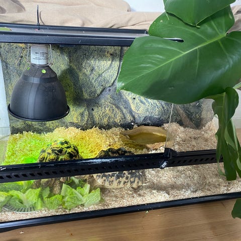 Komplett terrarium (uv-lampa och två värmelampor)med två dvärgskäggagamer, en hona 2,5 år och en hane 1,5 år. Ödlorna dvalar just nu, annars är de handtama och lugna.