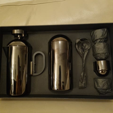 Helt oanvänt barset i rostfritt stål som inkluderar shaker, ishink, kylare och tång