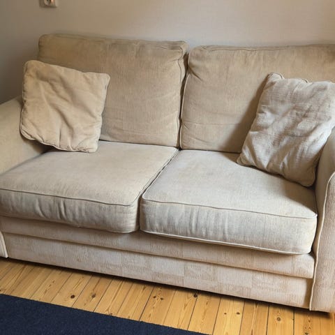 Soffa i beige tyg, 2-sits med mjuka sitt- och ryggdynor. Klädd i textil med lätt rundade armstöd. Passar som sittmöbel i vardagsrum eller liknande utrymme.