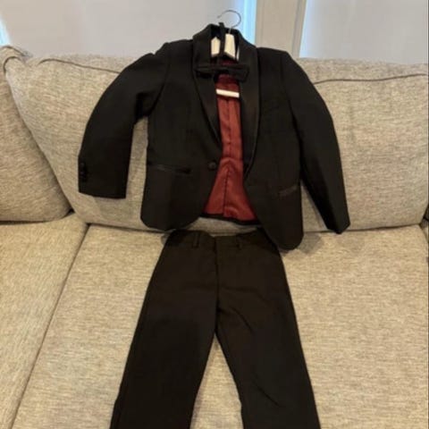 Lindex kostym för pojke i storlek 152. Tvådelad kostym bestående av kavaj och byxor i svart polyester. Kavajen har klassisk krage och knäppning framtill. Byxorna har linning med hällor och knäppning fram. Passar till högtider, fest eller andra tillfällen där mer uppklädd klädsel önskas.