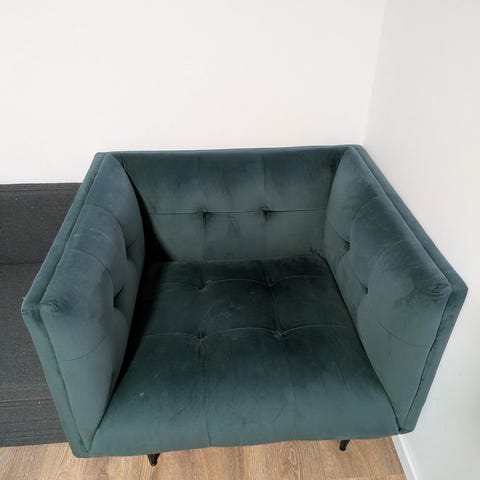 Fåtölj i sammet som vi har haft men inte använt då den har stått i ett hörn.