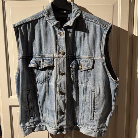 Fin jeansväst med krage, storl. 40. 2 bröstfickor, sleif i sidorna med 2 knappar med möjlighet att "dra" åt i midjan.