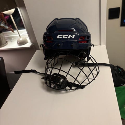 CCM Tacks 70 hockeyhjälm med galler i röd färg. Hjälmen har justerbara remmar och skyddande innervaddering. Gallret är i metall och fästs med spännen framtill och på sidorna. Passar för ishockey och liknande isaktiviteter där huvud- och ansiktsskydd krävs.