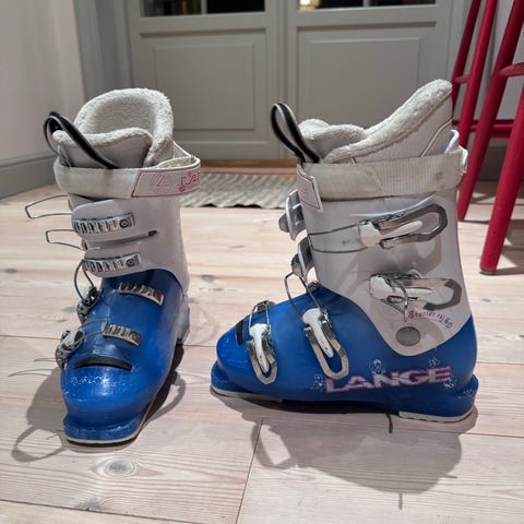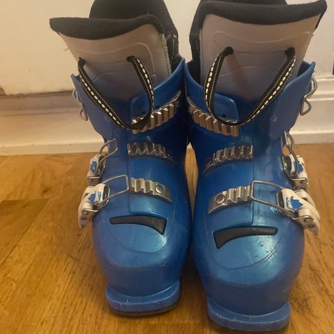 Nordica barn pjäxor i hårdplast med vitt skal, blå detaljer och rosa innersko. Pjäxorna har flera justerbara spännen i metall och greppvänlig sula. Passar för alpinskidåkning för barn. Exakt storlek framgår av märkningen på sulan på bilden.