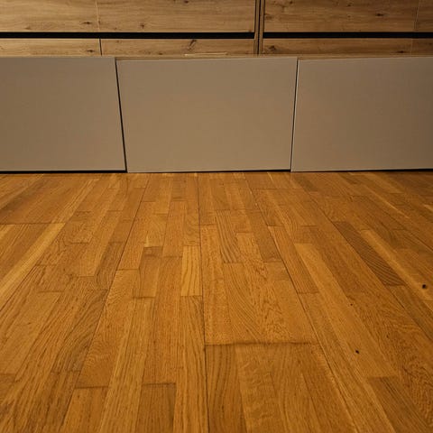 Bestå tv-bänk. Vit matt, gråmålade luckor, glasskiva.