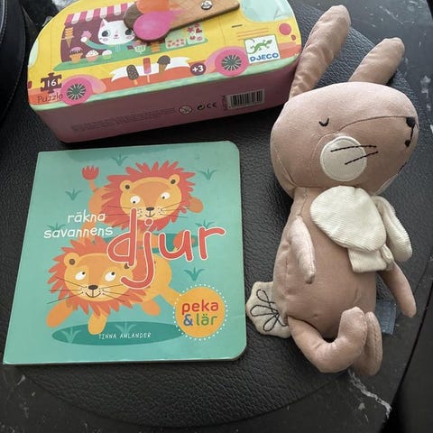 Diverse leksaker och gosedjur. Lilla kaninen jämte den blå snutten är en speldosa. Dockan låter om man tar bort nappen osv. Dom små figurerna har olika funktioner, den ena är en skallra och man kan snurra på huvudet så 'knackar' det. Den ena trycker man på huvudet så ändras ansiktet till ett annat ansikte osv. Pelikanen spelar musik när man kör den. Det ska tillhöra bollar som tyvärr är borta men den är rolig ändå och öppnar munnen. Helt nytt 'pussel', aktivering för hjärnan. Priset är för allt.