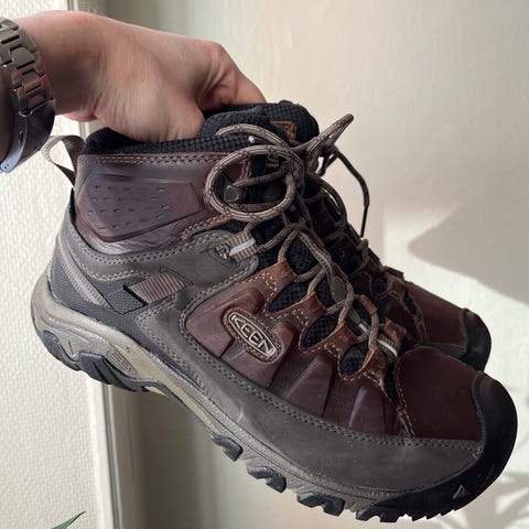 Stabila vandringskängor i storlek 42. Kängorna är tillverkade i brunt läder med högt skaft och kraftig snörning för stabil passform.