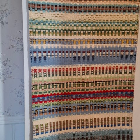Säljer en superfin handvävd, samisk rana i naturtrogna färger. Storlek 50 cm bred x 112 cm lång (132 cm med fransarna). Den är vävd och designad av Laila Persson i Purnu, Gällivare. Upphängningen i svart smidesjärn sitter på väggranan och följer med i köpet.
