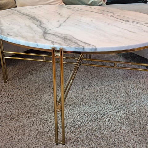 Vitt runt soffbord med glasskiva med marmormönster.