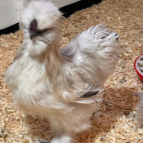 Amerikansk silkes tupp i hel vit. Han är en uppmärksam tupp, kläckt den 13 augusti 2025, men eftersom vi nu har fyra tuppar måste tyvärr några flytta ut.