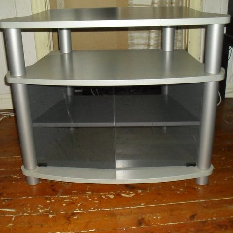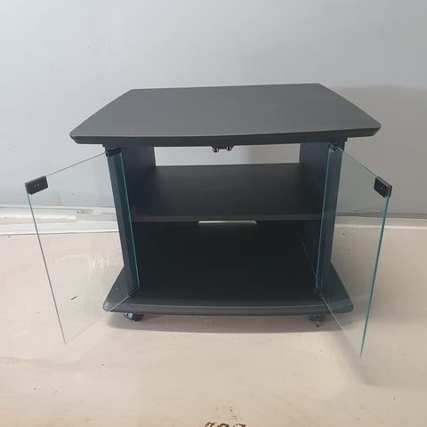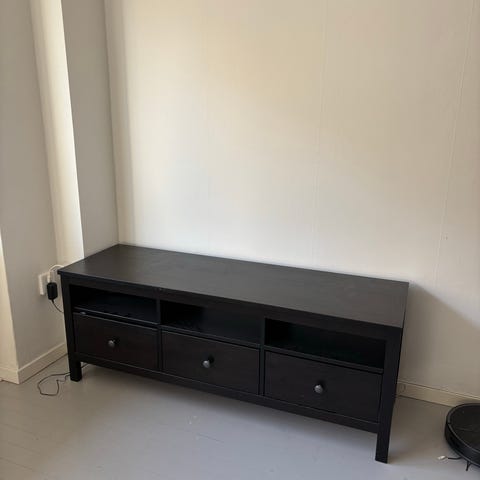 Ikea tv-bänk. Tv-bänken är i svart utförande med rektangulär form och rundade hörn. Framsidan har en glasdörr som kan öppnas åt sidan. Invändigt finns hyllplan för förvaring av tv-utrustning som mediaspelare, spelkonsol eller annan elektronik. Översidan är plan och anpassad för att bära en tv eller annan utrustning. Möbeln är avsedd för användning i vardagsrum eller liknande miljö där man behöver en kompakt tv- och mediabänk.