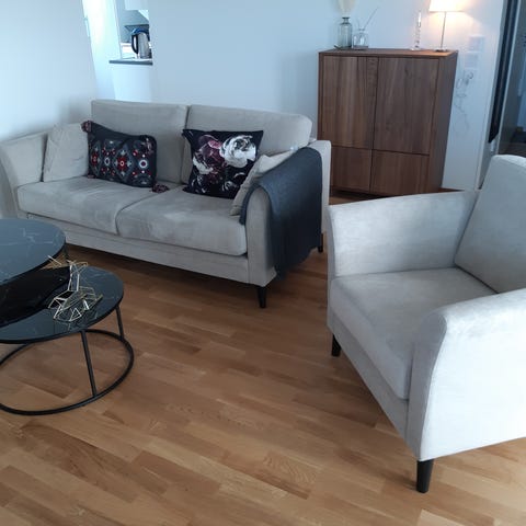 Säljer en Djursholm 1,5-sits fåtölj i ljusgrått sammet tyg.