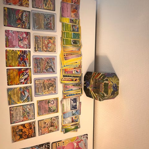 Pokémon samling spelkort med blandade motiv och typer. Kort i olika färger och kategorier, inklusive energi-, tränar- och pokémonkort. Passar för samlare eller för användning i Pokémon Trading Card Game. Antalet kort och specifika serier framgår inte exakt av bilden utan består av en blandad samling.