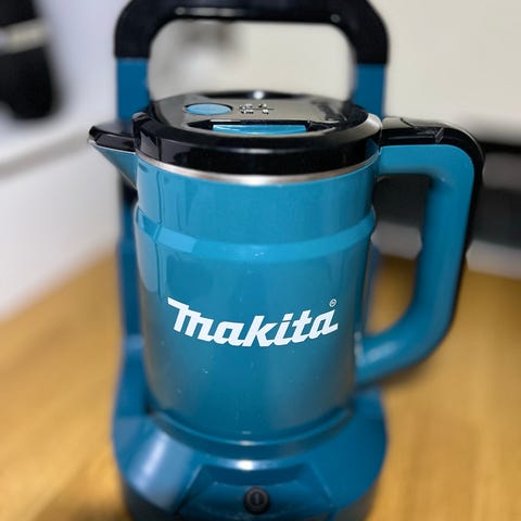 Makita kaffebryggare i blå färg. Kompakt modell anpassad för användning med Makita-batterier. Utrustad med avtagbar termosmugg i rostfritt stål och handtag för enkel hantering. Passar för bryggning av kaffe i mindre mängder, exempelvis på arbetsplats eller i garage. Har bara gått ett fåtal muggar