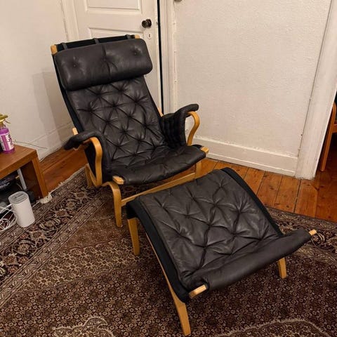 Bruno Mathsson fåtölj med hög rygg och snurrfot i krom. Den är i svart skinn och ett grått fårskinn specialgjort för fåtöljen får man med på köpet.