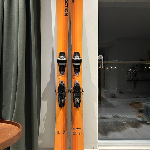 Black Crows alpinskidor med bindningar i blått och rött mönster. Skidorna har markerad midje- och spetsbredd enligt trycket på ovansidan samt monterade alpina bindningar. Passar för utförsåkning i pist. Exakt modell, längd och material framgår inte tydligt av bilderna.
