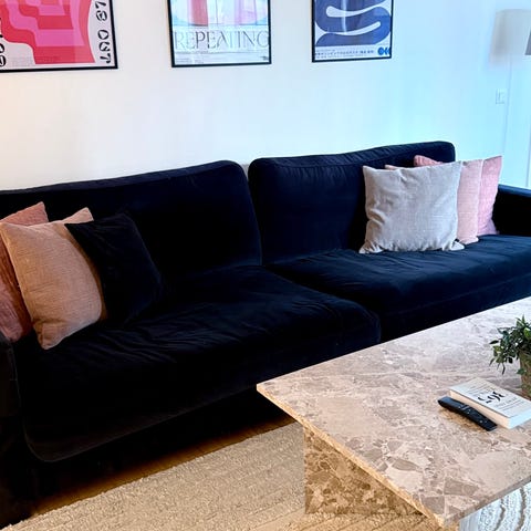 En modell större soffa i svart tyg, .Tyget har hög martindale vilket betyder hög slittålighet.Tvättbar.