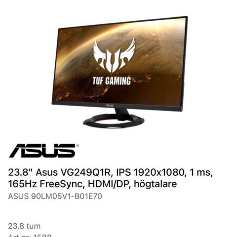 Hej, säljer min fina Asus Gamingskärm med 270Hz och 24 tum. Inköpt för lite mer än ett år sedan.