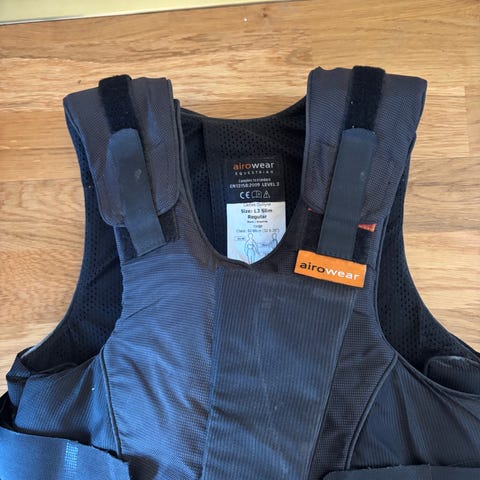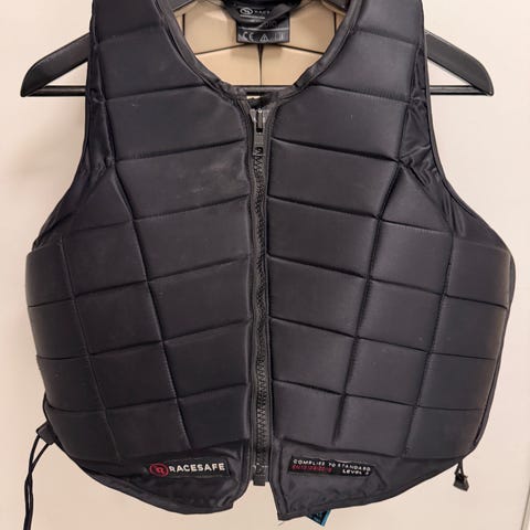 Racesafe RS2010 ryggskydd för barn i storlek Large. Utsida i slitstarkt material med svart yttertyg och beige stötdämpande paneler på insidan. Justerbar passform med elastiska band och snörning i sidan. CE-märkt skydd avsett för ridning eller liknande aktiviteter där ryggskydd krävs. Tvättråd och materialinformation finns på etiketten.