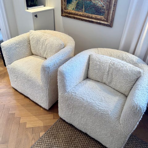 Två superfina och sköna fåtöljer från Ellos! Samma modell och färg, men den ena är i mycket fint skick (se bild 2-3) förutom en liten fläck som knappt syns (se bild 4). Den andra är lite mer använd (se bild 6-8) men fortfarande i fint skick!