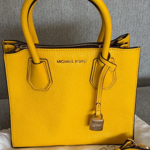 Michael Kors handväska i marinblått läder och gulddetaljer, Väskan har två axelremmar och metallfötter undertill som skyddar botten. Invändigt finns flera fack, inklusive dragkedjefack och öppna fack för mindre saker som mobil, nycklar och plånbok. Passar perfekt som jobb/skolväska.