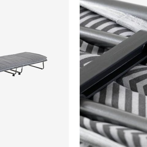 IKEA Norrudden extrasäng med madrass i grått tyg. Sängen har en metallram med nätbotten och är hopfällbar för enkel förvaring. Utrustad med hjul för att lätt kunna flyttas. Passar som extrasäng eller gästsäng i hemmet eller på sommarstället.