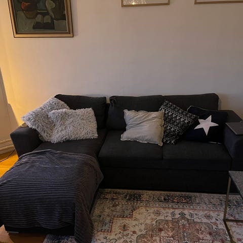 Går att bädda ut till dubbelsäng. Bra förvaring för kuddar och täcken i soffan.
