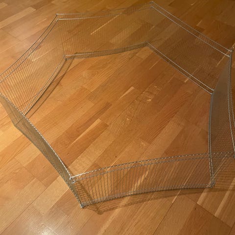 Hage för smådjur i två delar: en hopfällbar tygdel i vit färg och en sektion i metallgaller. Formen är månghörnig och lämpar sig för inomhusbruk på exempelvis golv. Passar för mindre husdjur som behöver en avgränsad yta att röra sig på under uppsikt. Tygdelen ger en mjukare inhägnad medan metalldelen ger en mer öppen och luftig avgränsning.