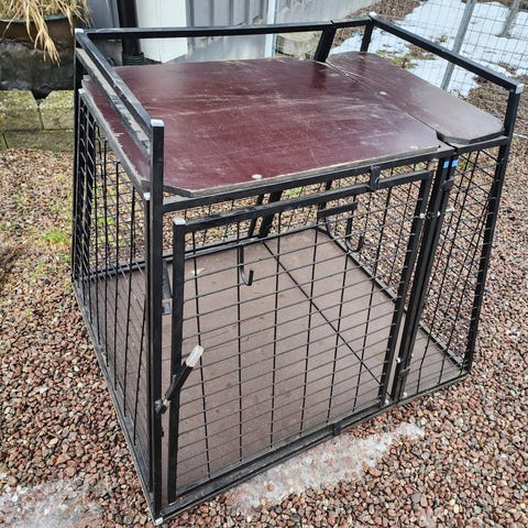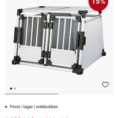 Hundbur i metall med dubbelöppning. Buren är avsedd för hund och har gallerkonstruktion med sned fram- och baksida som kan passa i bilens bagageutrymme. B nere 105 B uppe 75 D nere 82 D uppe 42 H 68 mellanvägg finns Boburen skrammelfri och säkerhetslucka bak