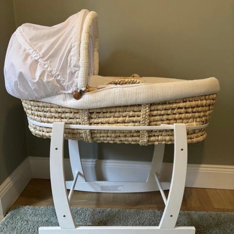Baby Moses basker från Clair de Lune, (OBS det står JLY i beskrivningen men det är fel, Clair de Lune fanns inte med som alternativ när varumärke ska anges) en vagga i form av en korg på trästativ. Vaggans liggdel består av en flätad korg med handtag och avtagbart vitt överdrag. Överdelen har en vit huva som ger skugga och ombonad känsla. Trästativet är utformat för att ge en mjuk vaggande rörelse. Vaggans storlek är anpassad för spädbarn under den första tiden och kan användas som sovplats i sovrum eller vardagsrum.