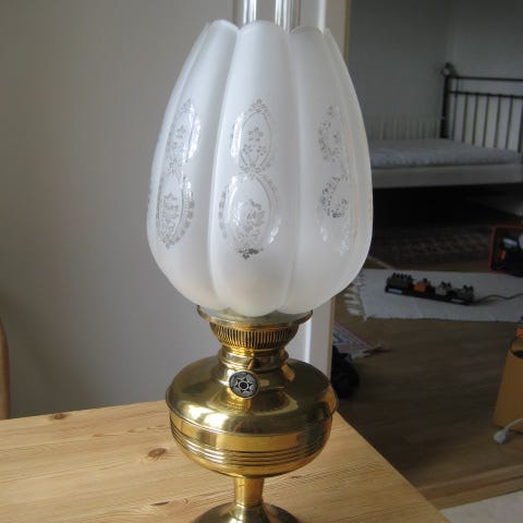 Säljer en ovanligt hög och pampig bordslampa i tidlös fotogenmodell. Med sin imponerande höjd på cirka 65 cm blir den ett magnifikt blickfång i ett större fönster, på en skänk eller ett sidobord.