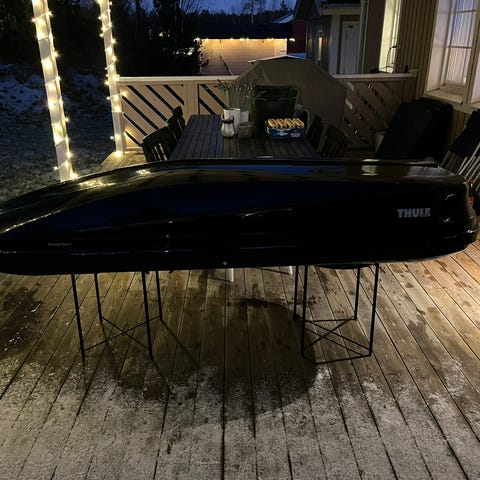 Utrustad med Thules patenterade snabbfäste ”Power Grip”. Innebär att boxen monteras på takräcke/lastbågar på två minuter.