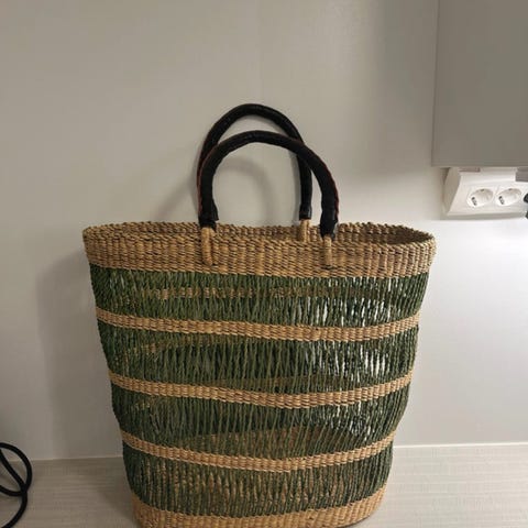 väska i strå för kvinna. Väskan är rektangulär med två flätade handtag och ett mönster av diagonala ränder. Passar för vardagsbruk, strand eller lättare shopping. Materialet är flätat strå som ger en luftig och somrig känsla. Ny aldrig använd