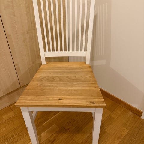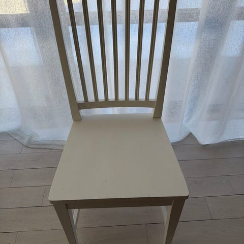 4 vita stolar säljes. Köpta på Mio. Gedigna i trä. Det finns slitage så som färgskav och repor men de är fullt funktionsdugliga.