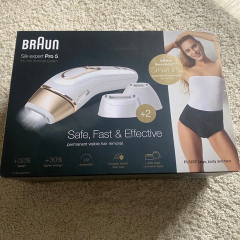 Braun Silk·expert Pro 5 IPL hårborttagningssystem i vit/guld färg. IPL-enheten är avsedd för hårborttagning på kropp och eventuellt ansikte enligt tillverkarens anvisningar. Setet på bilderna inkluderar IPL-apparat, nätadapter, flera behandlingshuvuden samt en förvaringsväska. Produkten använder ljuspulser (IPL-teknik) och har olika inställningar som kan anpassas efter användarens behov enligt bruksanvisningen. Lämplig för hemmabruk för den som vill reducera oönskat hår på utvalda kroppsdelar, med användning enligt Brauns säkerhets- och hudtonsriktlinjer.