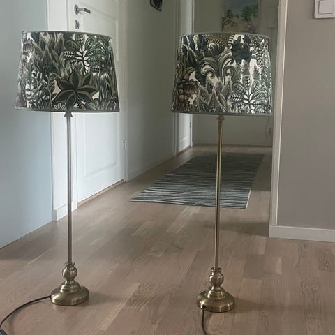 Ett par vägglampor med en unik design. Lamporna har en vit skärm och en detalj i mässingsfärg. Sladd med strömbrytare ingår.